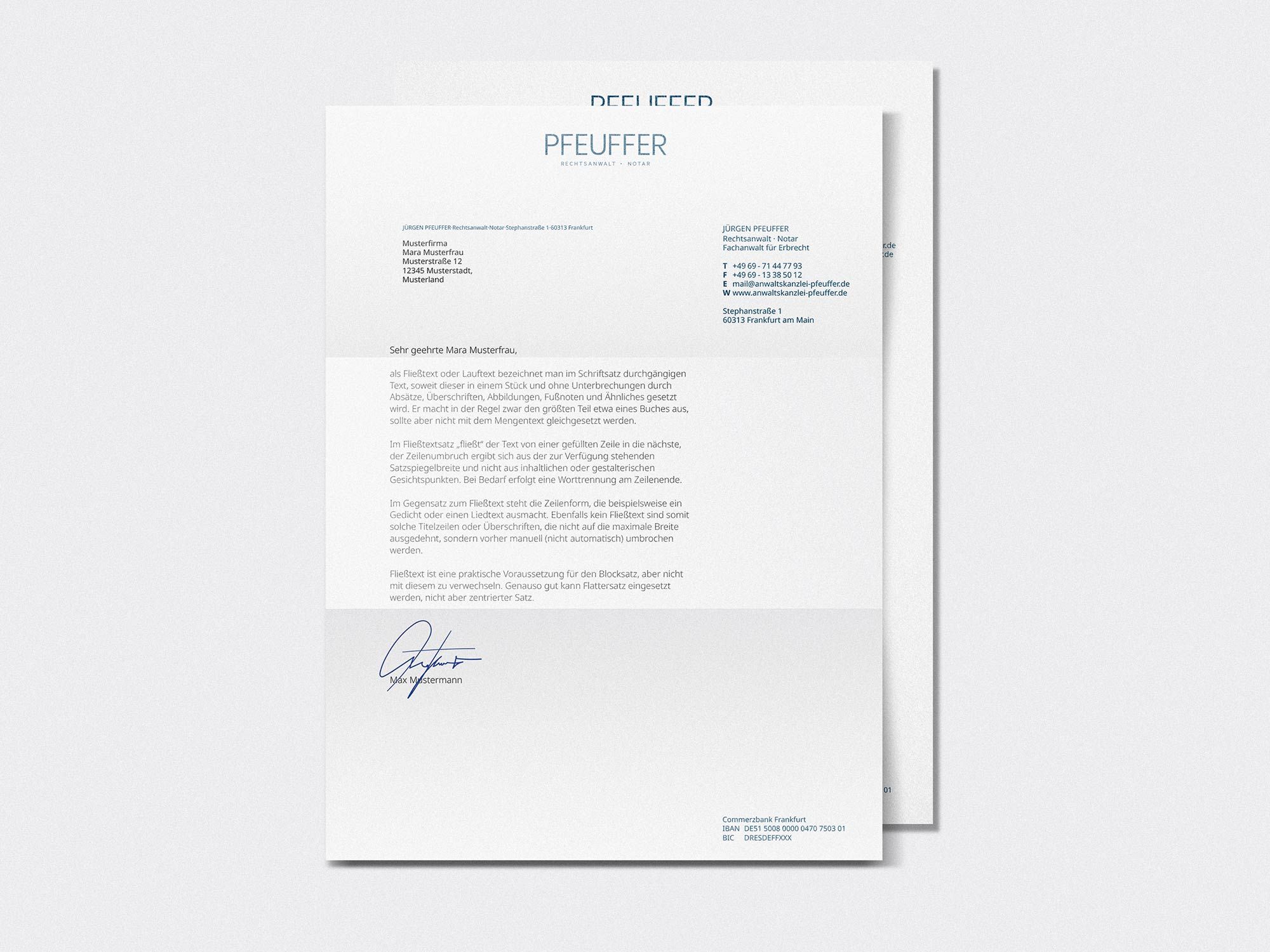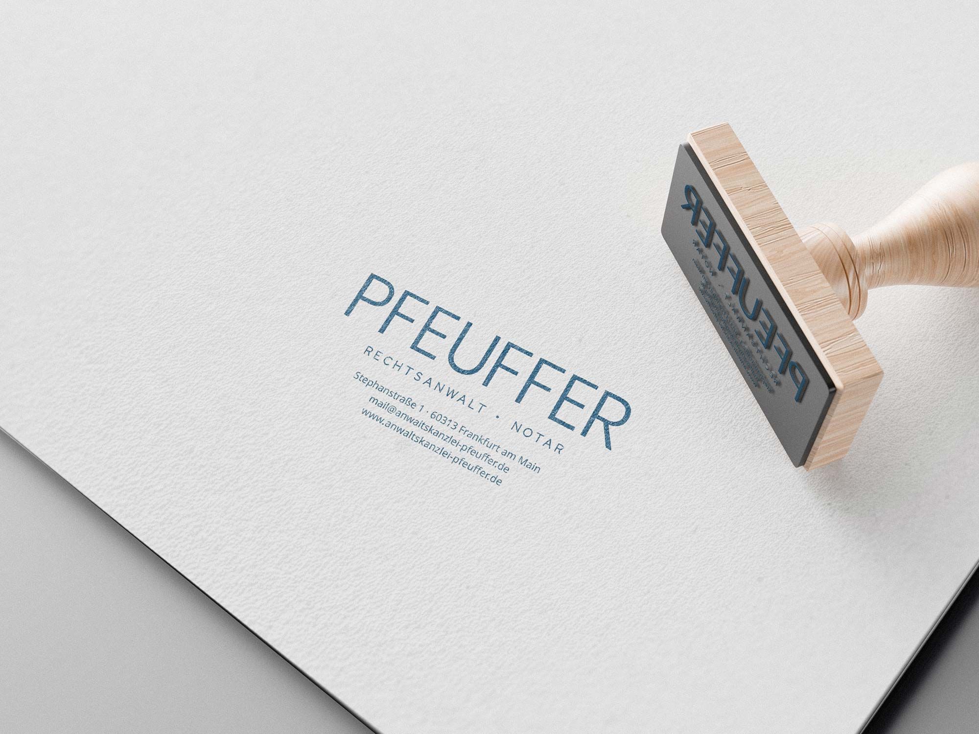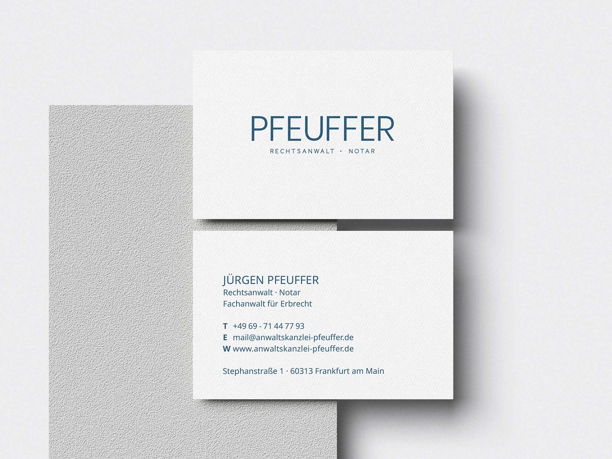 Für Jürgen Pfeuffer, Rechtsanwalt und Notar sowie Fachanwalt für Erbrecht in Frankfurt am Main, wurde ein Markenauftritt entwickelt, der die langjährige Erfahrung und fachliche Spezialisierung klar und professionell widerspiegelt. Ziel war es, die klassische Seriosität der Kanzlei mit einem modernen, zeitgemäßen Erscheinungsbild zu verbinden.